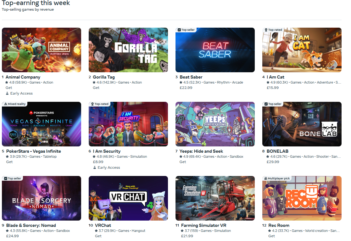 В Horizon Store набирает силу новый лидер игровых чартов. Animal Company от студии Wooster Games сумела стать самой доходной игрой недели на Quest, опередив Gorilla Tag и Beat Saber. И это не сиюминутный прыжок: у игры десятки тысяч отзывов и высокий рейтинг.