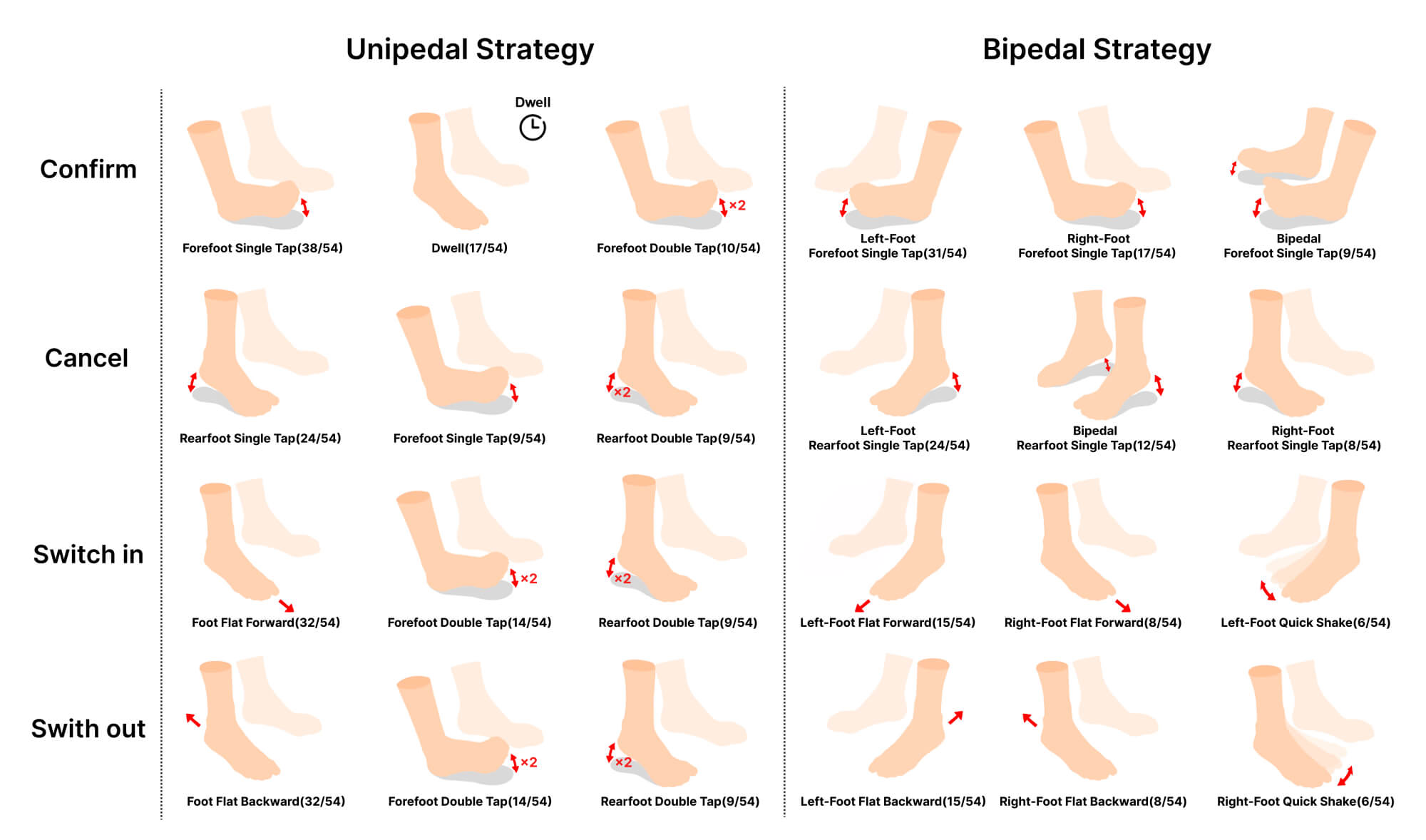 В исследовании фигурируют такие команды, как подтверждение, удаление и переключение меню. Например, постукивание по полу подушечкой стопы означает «подтвердить», постукивание пяткой — «удалить», а перемещение всей стопы вперед или назад обеспечивает переход между областями интерфейса.