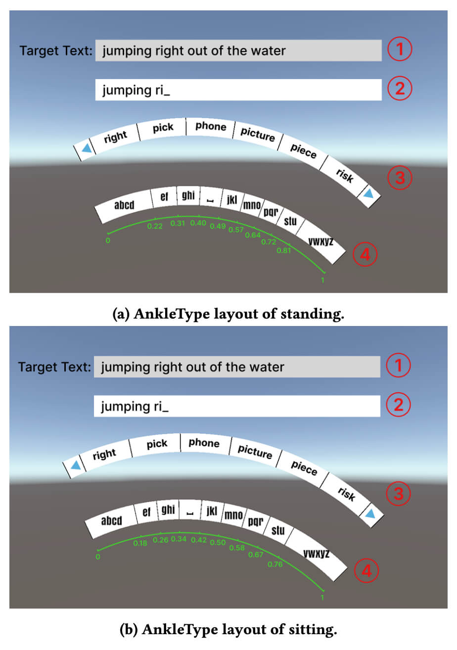 Для написания текста в виртуальной реальности нам чаще всего приходится полагаться на руки и глаза. В этом кроются затруднения: глаза устают, а руки могут быть заняты или иметь неточные движения из-за особенностей здоровья. Экспериментальная система AnkleType от китайской исследовательской группы Городского университета Гонконга и Университета Шаньтоу решает проблему с помощью ног.