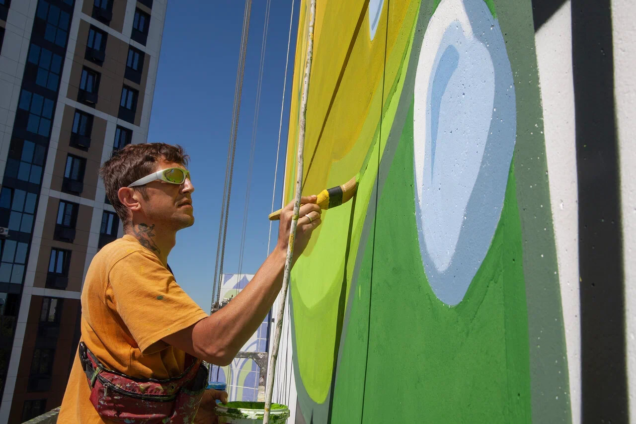 Полиптих, как рассказала Голографике НОВЬ, встроен в геометрию типовой панельной архитектуры как единое полотно, которое на разных уровнях должно расшифровывать концепцию «города-сада» — равновесное сосуществование промышленности и природы. Каждый мурал стал главой истории о том, как в индустриальном городе рождается, расцветает и сохраняется жизнь.