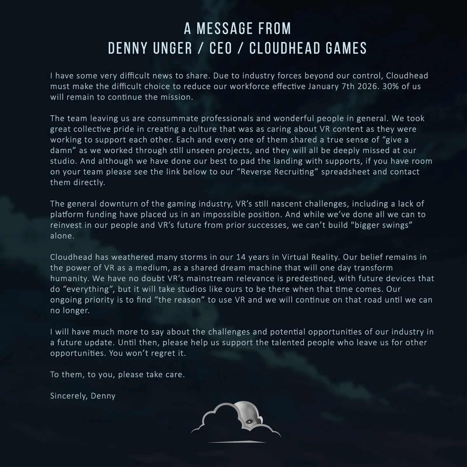 Директор пообещал позже более подробно раскрыть положение дел в индустрии и опубликовал контакты более 30 сотрудников, покидающих Cloudhead, чтобы помочь им в поиске работы. Большинство живёт в Канаде и предпочитает удалённый труд. В студии осталось 16 человек, а всего увольнения затронули 40 человек.