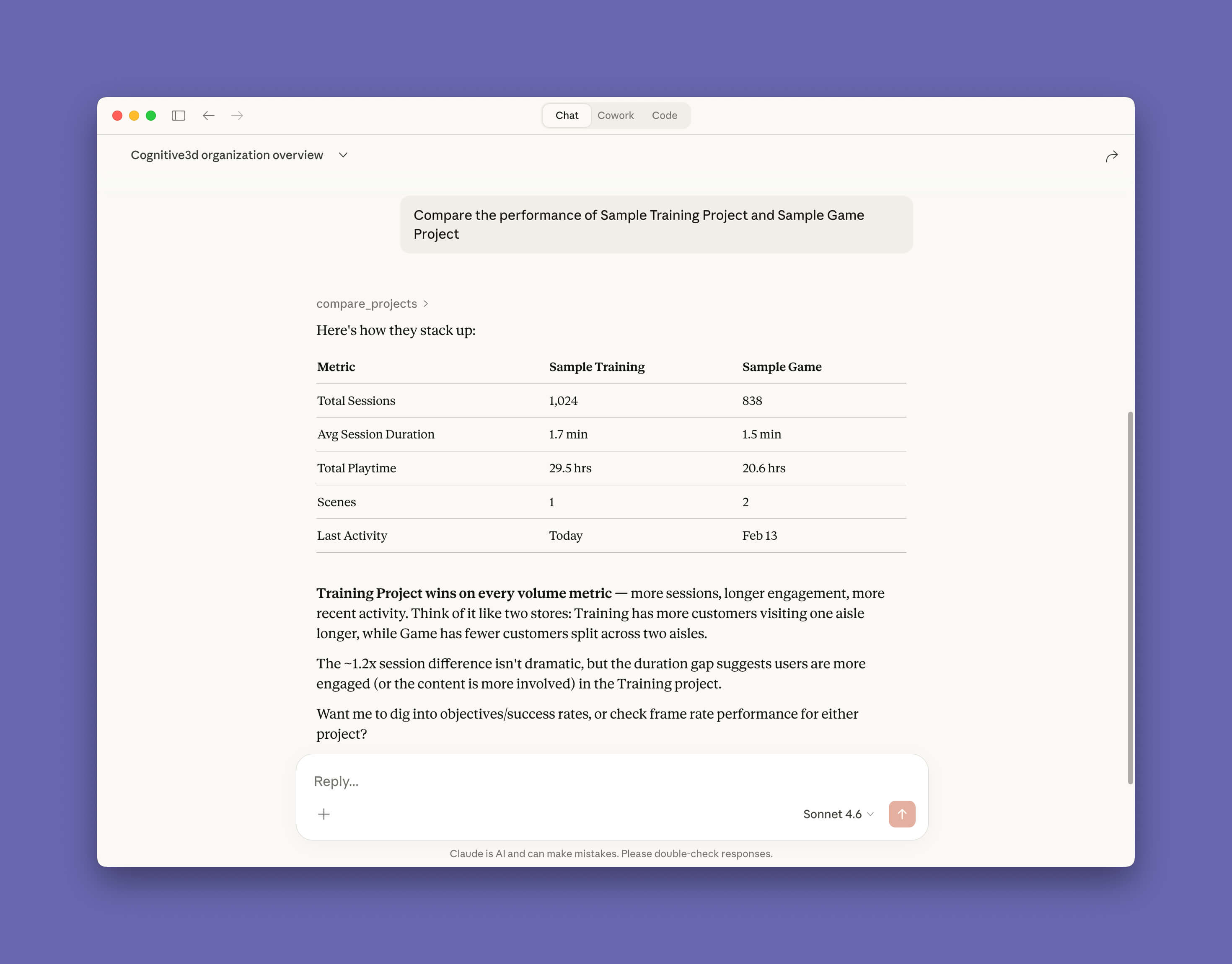 MCP Server подключает ИИ-помощников к API Cognitive3D, преобразуя вопросы на естественном языке в структурированные запросы для API, и выдаёт ответы в диалоговом режиме. Cognitive3D отмечает низкий порог входа, благодаря которому пользоваться данными из платформы могут люди с любой подготовкой.