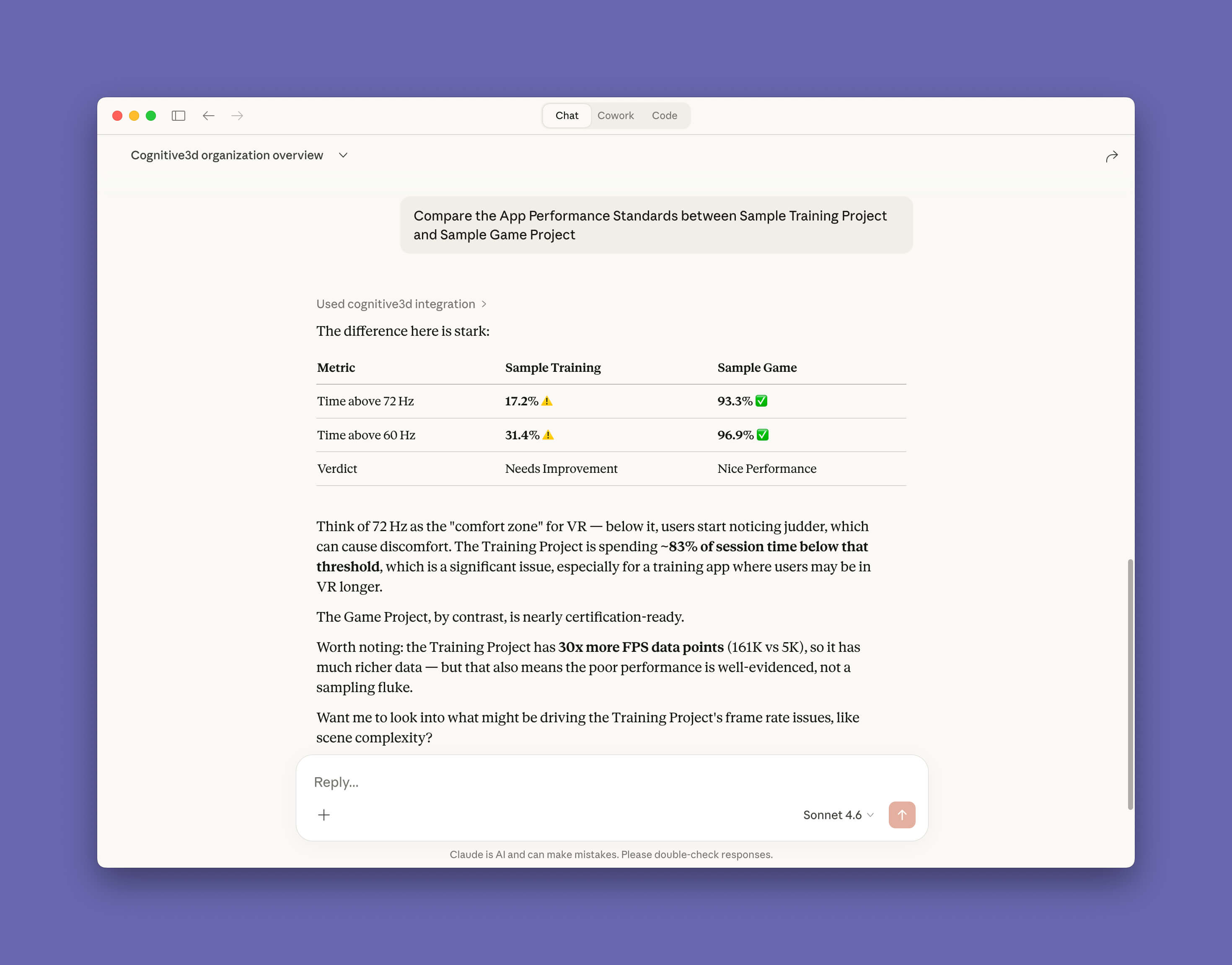MCP Server подключает ИИ-помощников к API Cognitive3D, преобразуя вопросы на естественном языке в структурированные запросы для API, и выдаёт ответы в диалоговом режиме. Cognitive3D отмечает низкий порог входа, благодаря которому пользоваться данными из платформы могут люди с любой подготовкой.