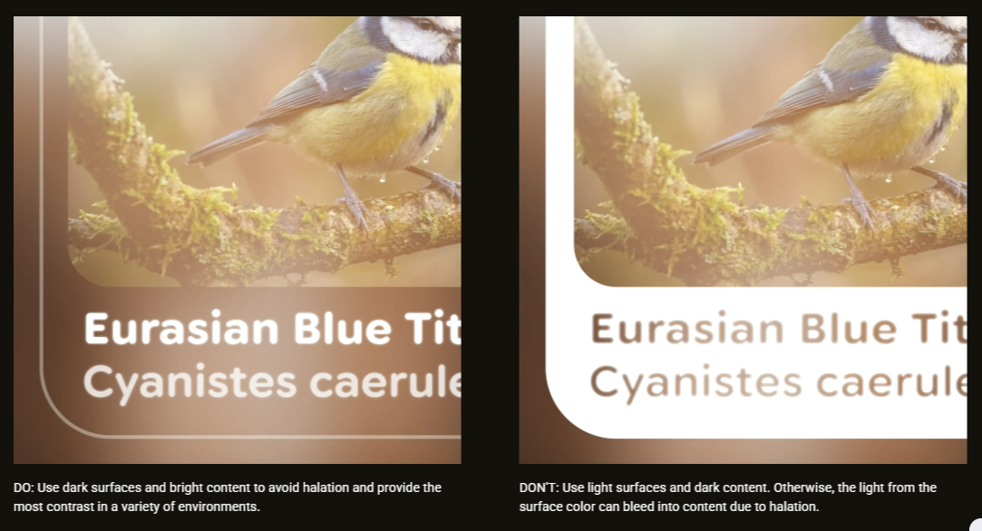 Поскольку цвета на экране сливаются с фоном, Google рекомендует сохранять интенсивность, а не усиливать насыщенность, так как более тёмные оттенки теряются на прозрачных экранах.