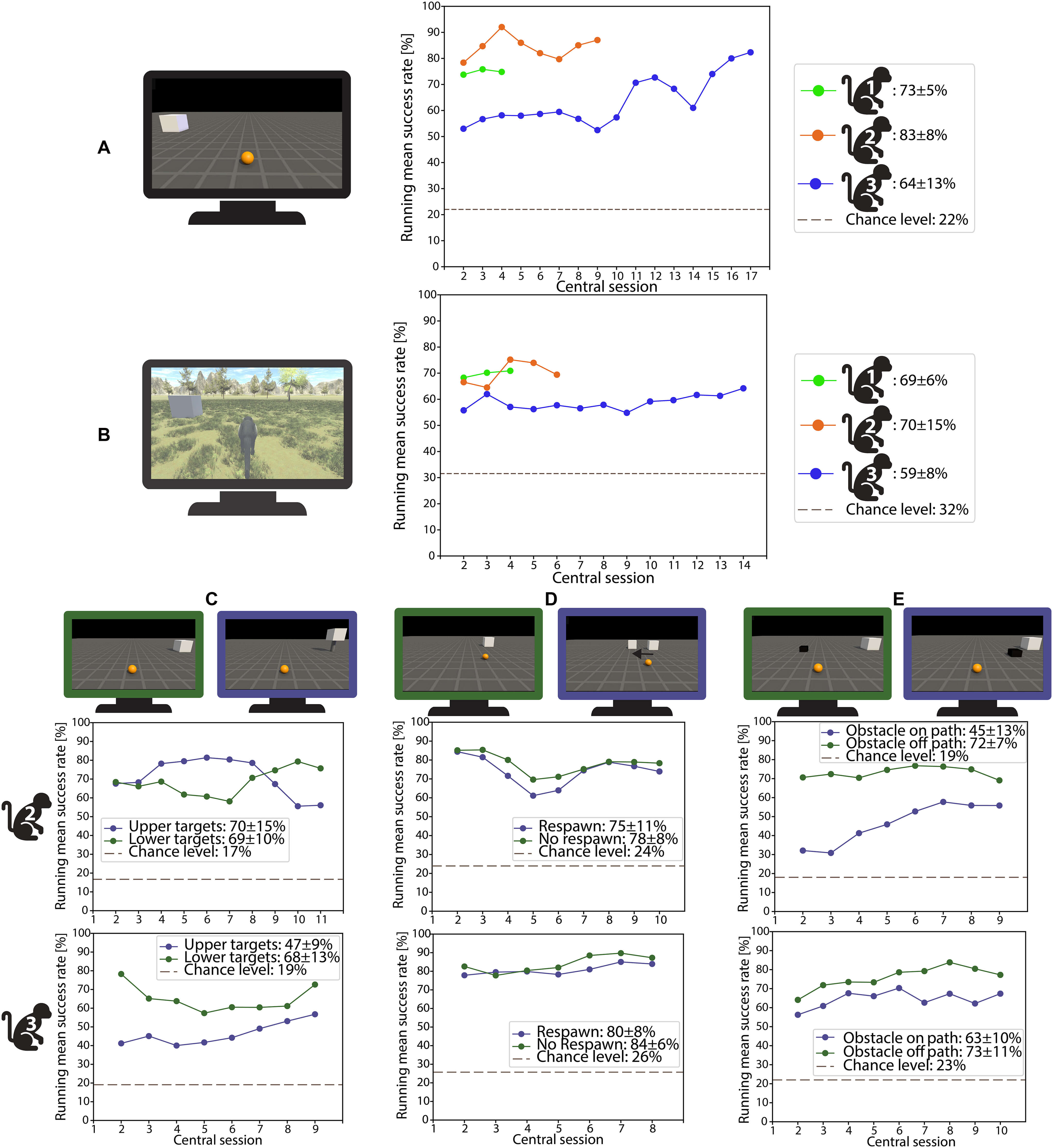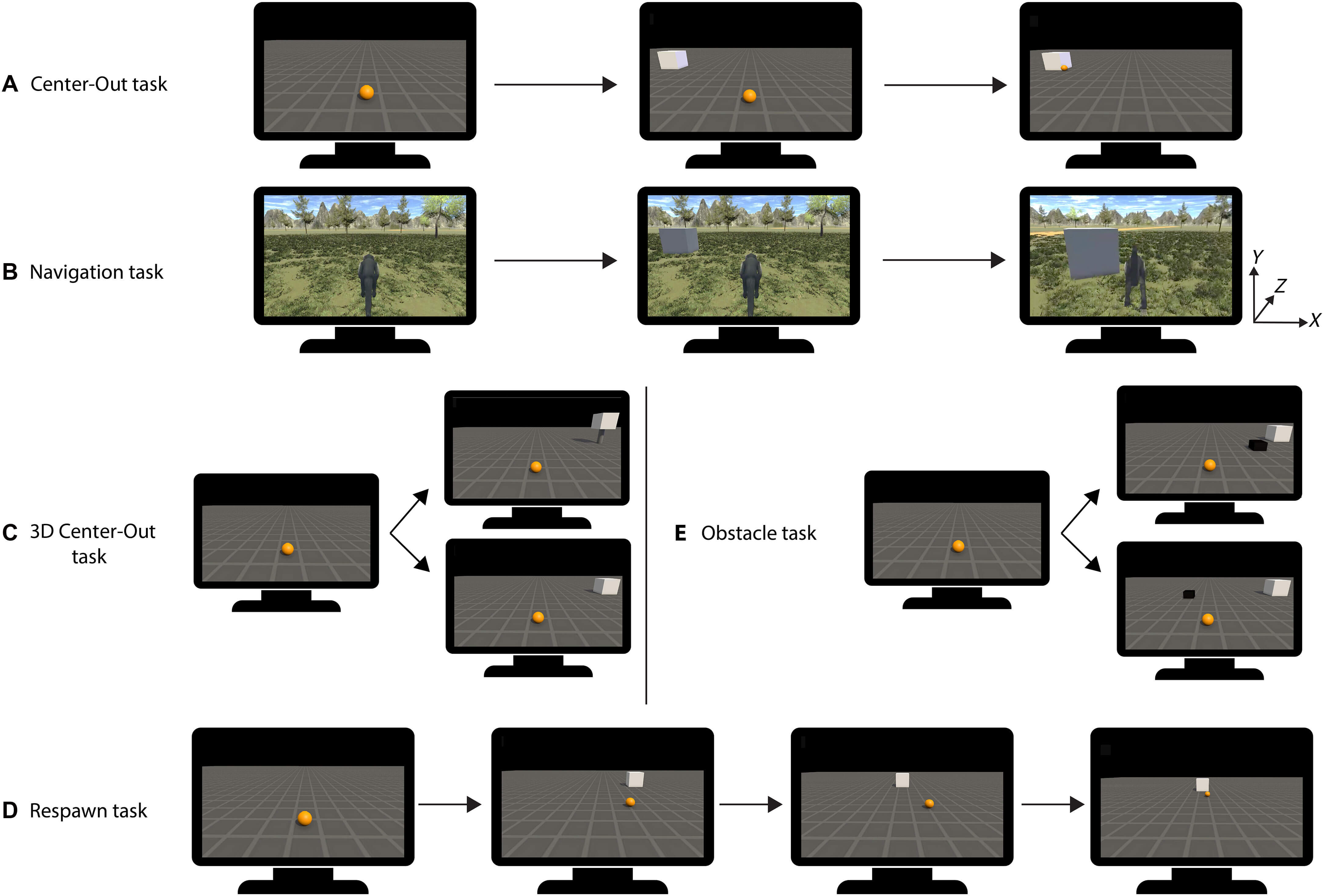 - ВР-навигация: команда создала реалистичную 3D-среду, в которой макаки должны мысленно управлять сферой или аватаром, чтобы непрерывно двигаться и обходить препятствия в сложных условиях. Это в значительной степени имитирует реальные задачи навигации, связанные с инвалидными креслами или протезами.