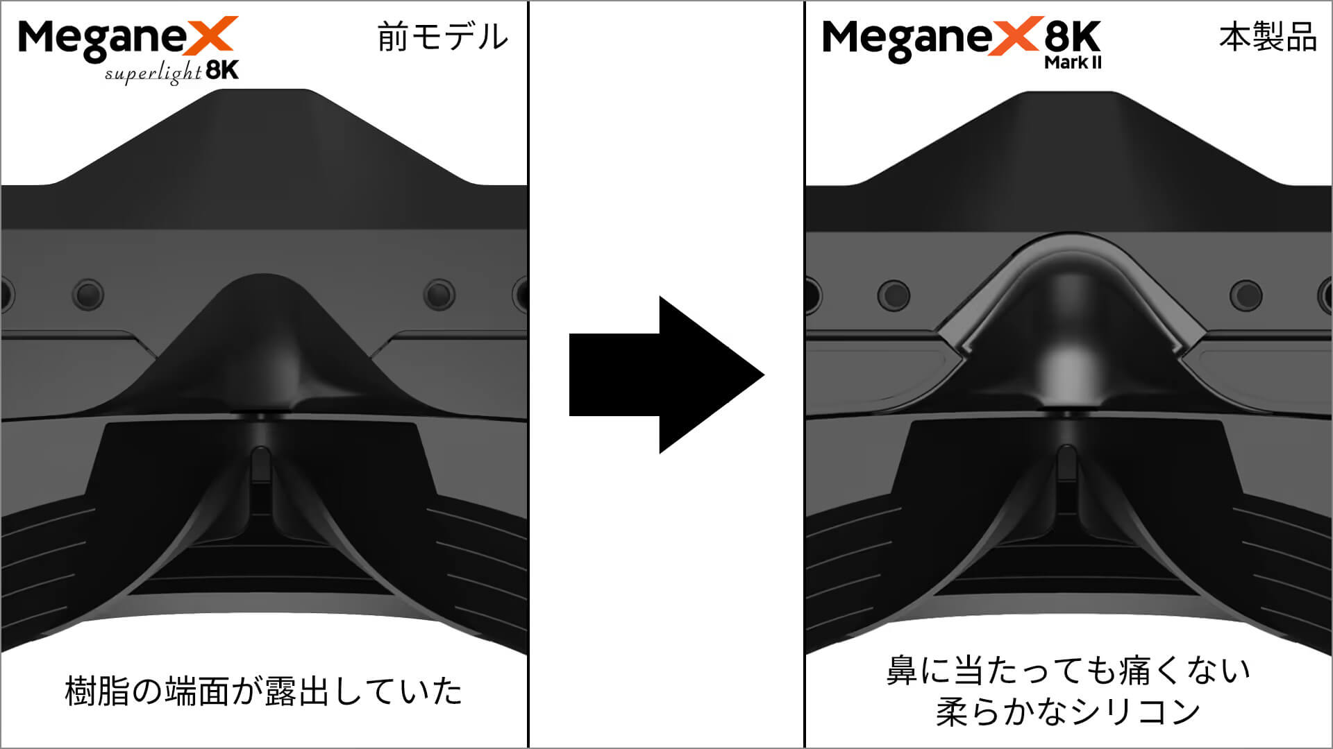 Mark II — это улучшенная версия очков MeganeX superlight 8K. Здесь осталась плоская оптика и дисплеи microOLED с разрешением 4K (3552×3840 на каждый глаз и 7104×3840 всего), частотой 90 Гц и 10-битным цветом. Компания отдельно подчёркивает, что HDR работает в программном обеспечении VRED от Autodesk. Конструкция без креплений весит 179 граммов.
