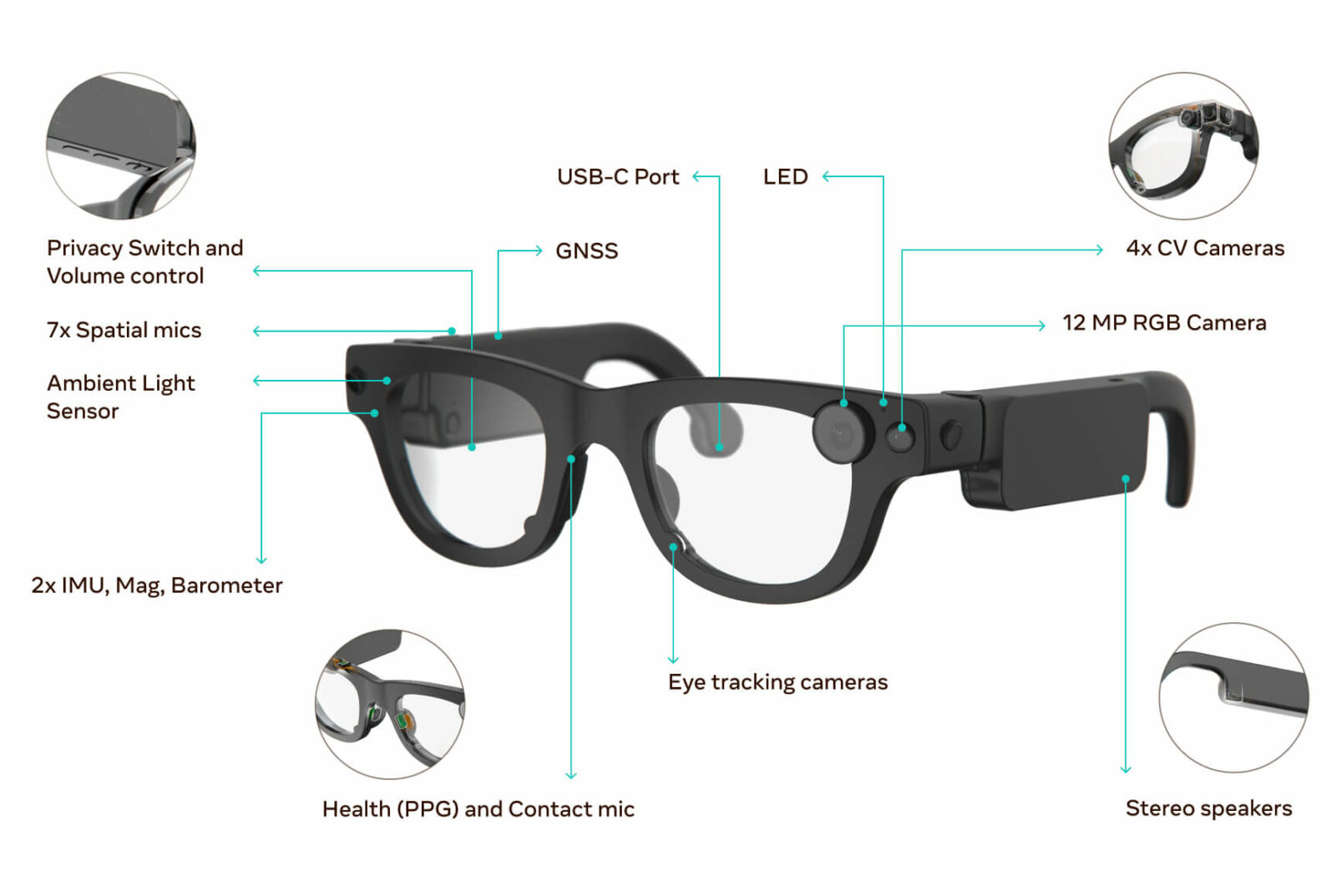 Наряду с улучшенной системой отслеживания глаз Aria Gen 2 обладают четырьмя камерами, обращёнными наружу, против двух в предыдущей модели. Они могут отслеживать руки и другие объекты в трёхмерном пространстве, например для тонких манипуляций руками роботов. Стереоперекрытие в Gen 2 увеличили с 35° до 80°, что улучшает восприятие глубины и пространственную осведомлённость устройства.