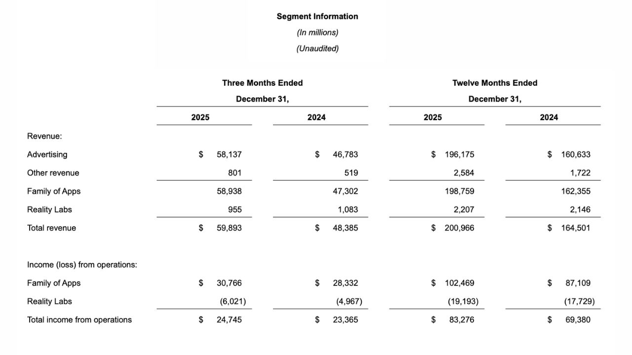 Годовой финотчёт Meta* говорит о росте выручки на 22% до $201 млрд (₽15,4 трлн), росте количества показов рекламы в приложениях на 12% и росте средней цены за рекламу на 9%. Численность персонала на 31 декабря 2025 года составила 78 865 человек, что на 6% больше, чем годом ранее. Чистая прибыль составила $22,8 млрд (₽1,7 трлн).
