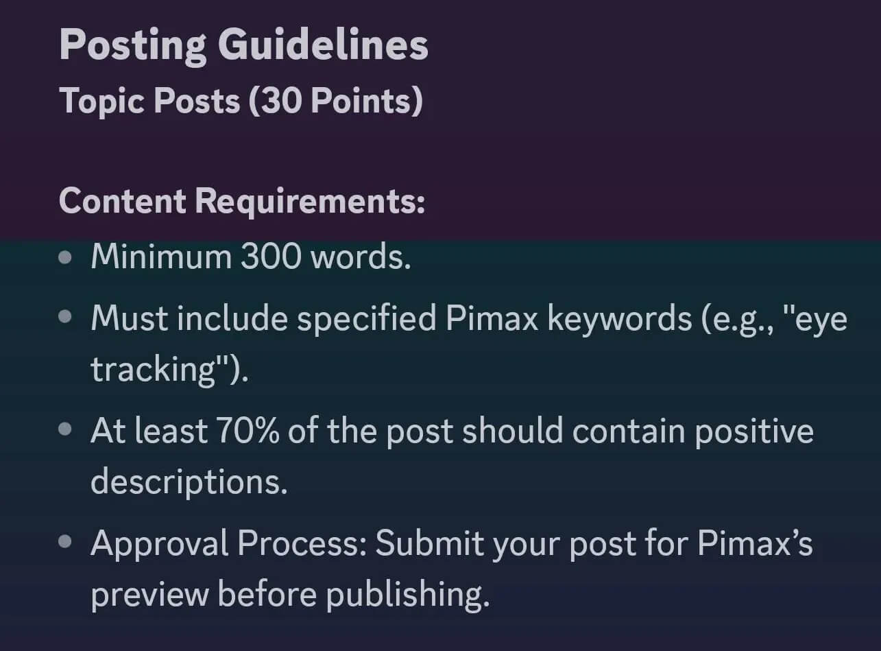 Компания подтвердила подлинность утечки. Программа предполагала выдачу виртуальных баллов за размещение положительных отзывов о продукции Pimax, включая будущую модель Crystal Super и линейку Dream Air. Баллы можно было обменивать на подарочные карты, скидки и даже субсидированную поездку в штаб-квартиру компании в Шанхае. Темы публикаций варьировались от «первого опыта с Pimax» до советов по эксплуатации устройств.