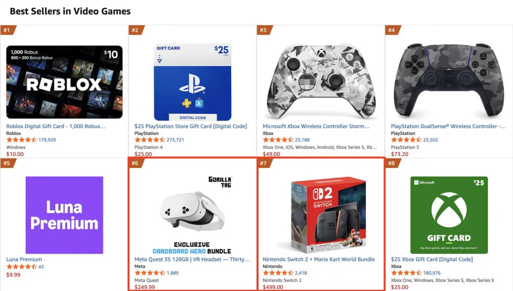 Все прочие игровые консоли продавались хуже, чем Quest и Switch 2. В списке бестселлеров Amazon в категории «Видеоигры» Quest 3S на 128 ГБ борются с комплектом Nintendo за шестое и седьмое места. PlayStation 5 были на 13-м месте, Quest 3 (512 ГБ) — на 24-м, а Xbox Series X — на 60-й позиции списка «бестселлеров».