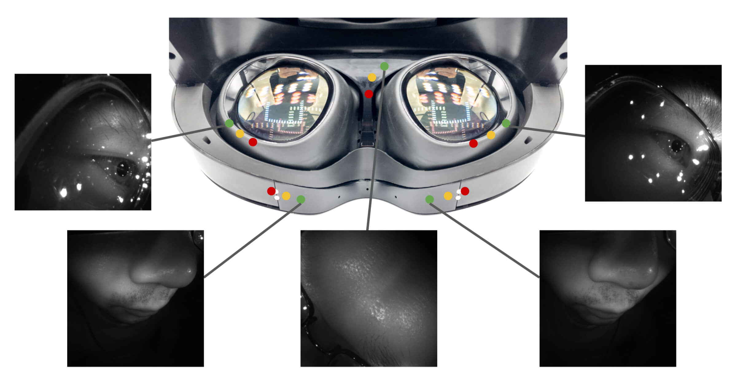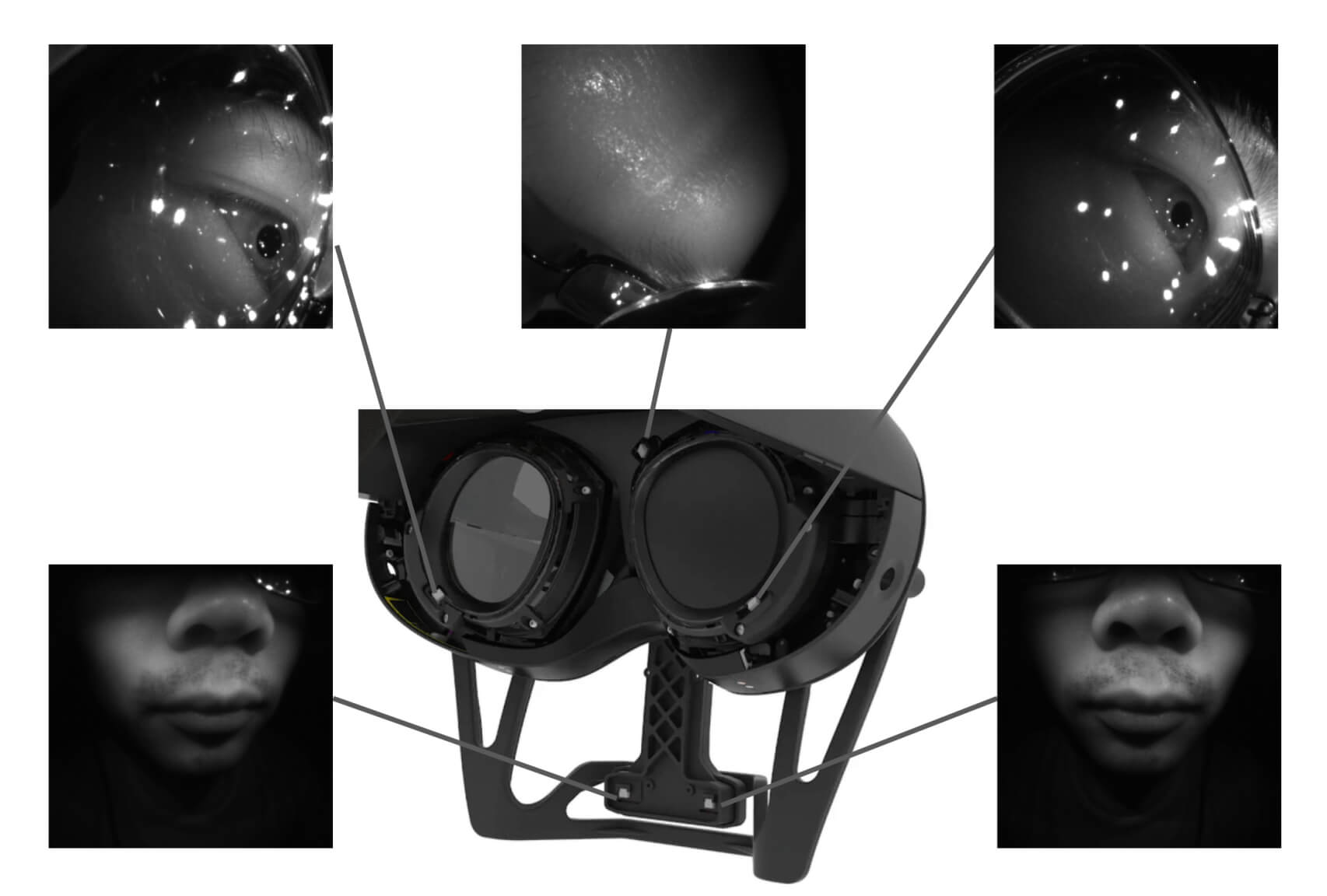 В основе решения лежат пять инфракрасных камер, интегрированных в корпус очков. Они фиксируют лицо пользователя в непосредственной близости так, чтобы отслеживать движения глаз, рта и области между бровями, несмотря на частичное перекрытие лица самим устройством. Такой захват помогает собирать последовательности изображений даже при слабом внешнем освещении.