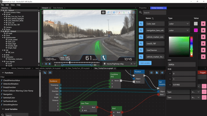 В основе бизнеса Basemark разработка ПО, с помощью которого OEM-производители создают решения дополненной реальности для проекционных дисплеев, приборных панелей, информационно-развлекательных систем и других автомобильных экранов. Rocksolid AR — платформа для создания приложений, повышающих ситуационную осведомлённость и безопасность водителя через контекстную навигацию, подсказки полос движения, предупреждения о столкновениях и визуализация других систем помощи. А Studio является редактором в рамках этой платформы.