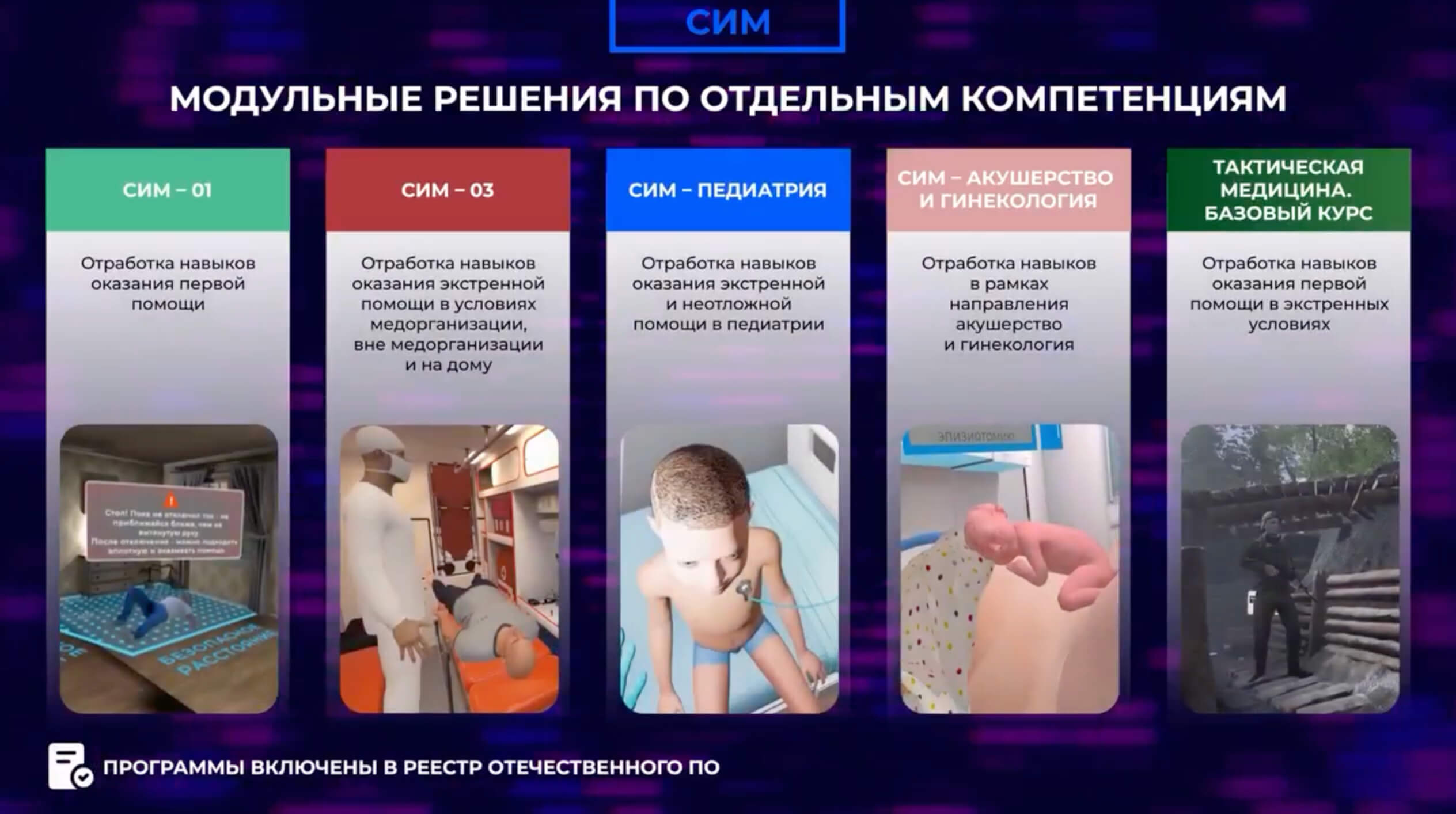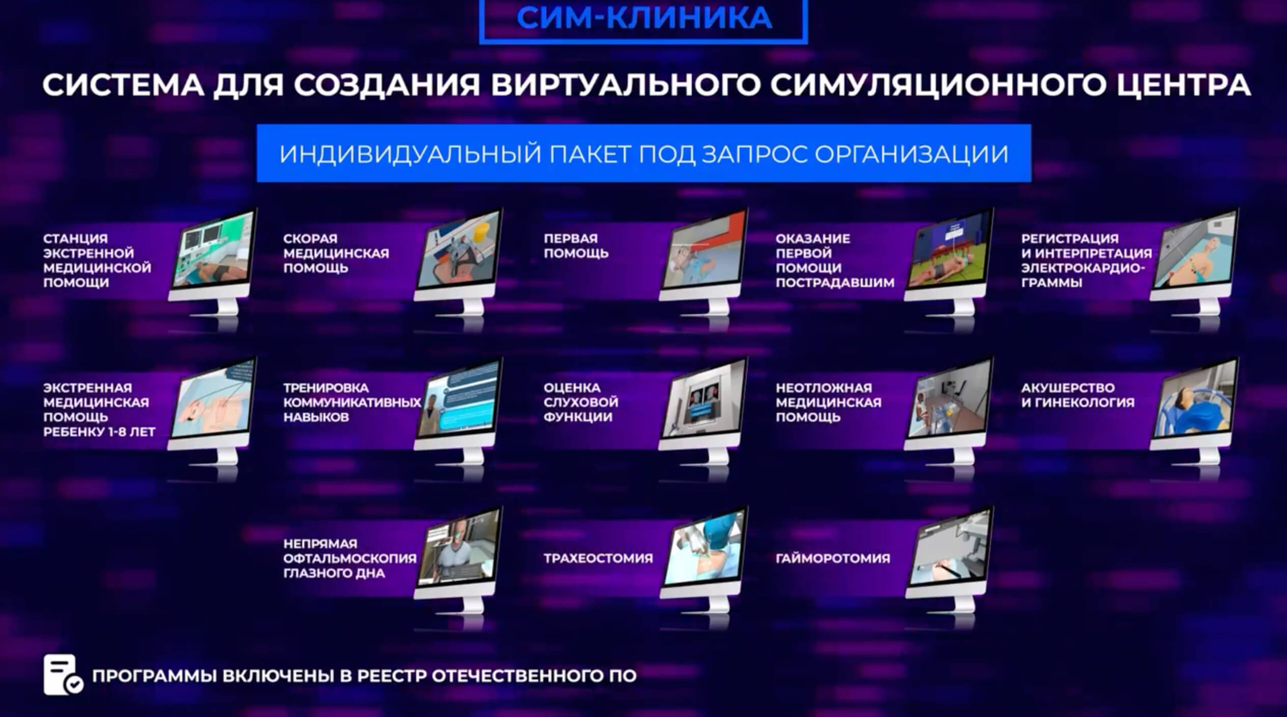 Помимо модулей, в линейке СИММЕД есть комплексное решение для создания виртуального симуляционного центра — СИМ-Клиника. Это инструмент формирования индивидуального набора симуляторов под конкретные задачи с масштабированием тренажёров и рабочих мест. Продукт актуален для вузов и учреждений среднего профессионального образования с ограниченной инфраструктурой, региональных медицинских учреждений, а также центров, которым необходимо быстро развернуть симуляционное обучение.