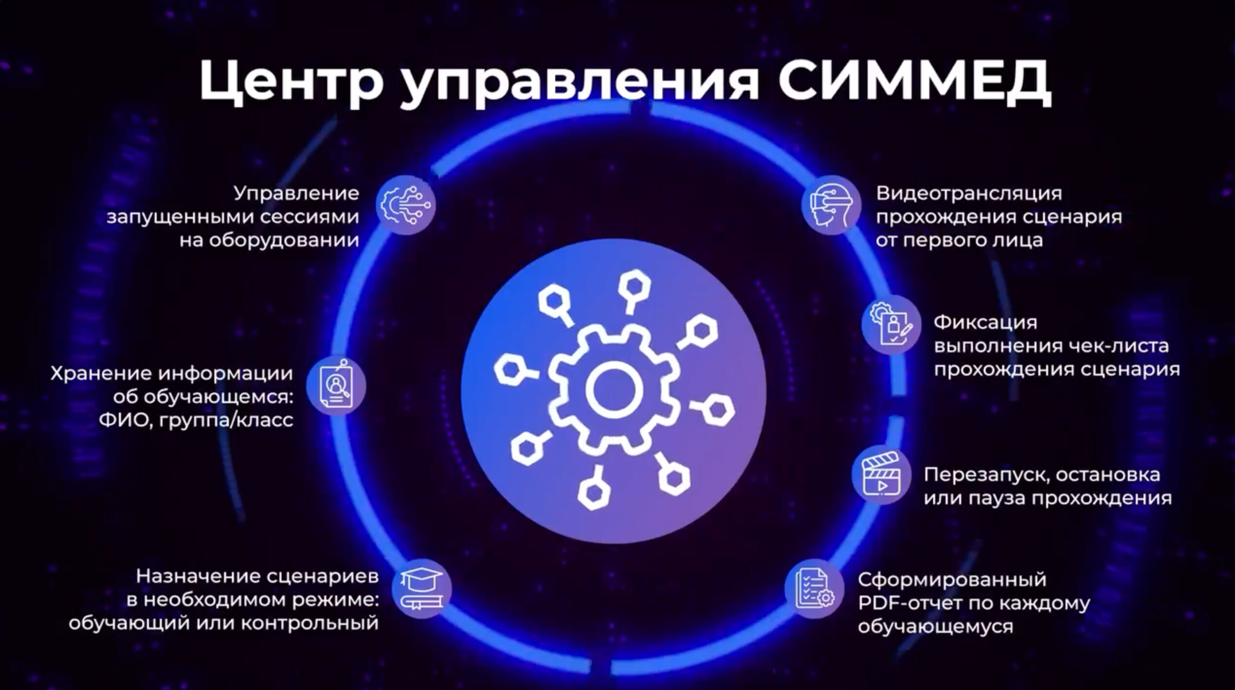 Программный центр управления СИММЕД объединяет все симуляторы, управляет устройствами и учебными сессиями, отслеживает действия обучающихся в реальном времени, обеспечивает трансляции от первого лица, контроль выполнения по чек‑листам и автоматическое формирование отчётов.