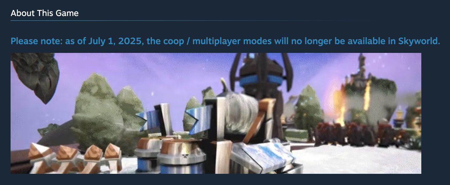Поддержку многопользовательской игры свернули после того, как в июле 2025 года закрылся лежащий в её основе сервис сетевой коммуникации UNet от Unity. Лидер рынка игровых движков признал решение устаревшим и заменил другими технологиями, пообещав новые высоты производительности, масштабируемости и безопасности. От смены сетевого стека пострадали многие проекты, которым разработчики, как и в случае со Skyworld: Kingdom Brawl, не сумели или не захотели обеспечить переезд.