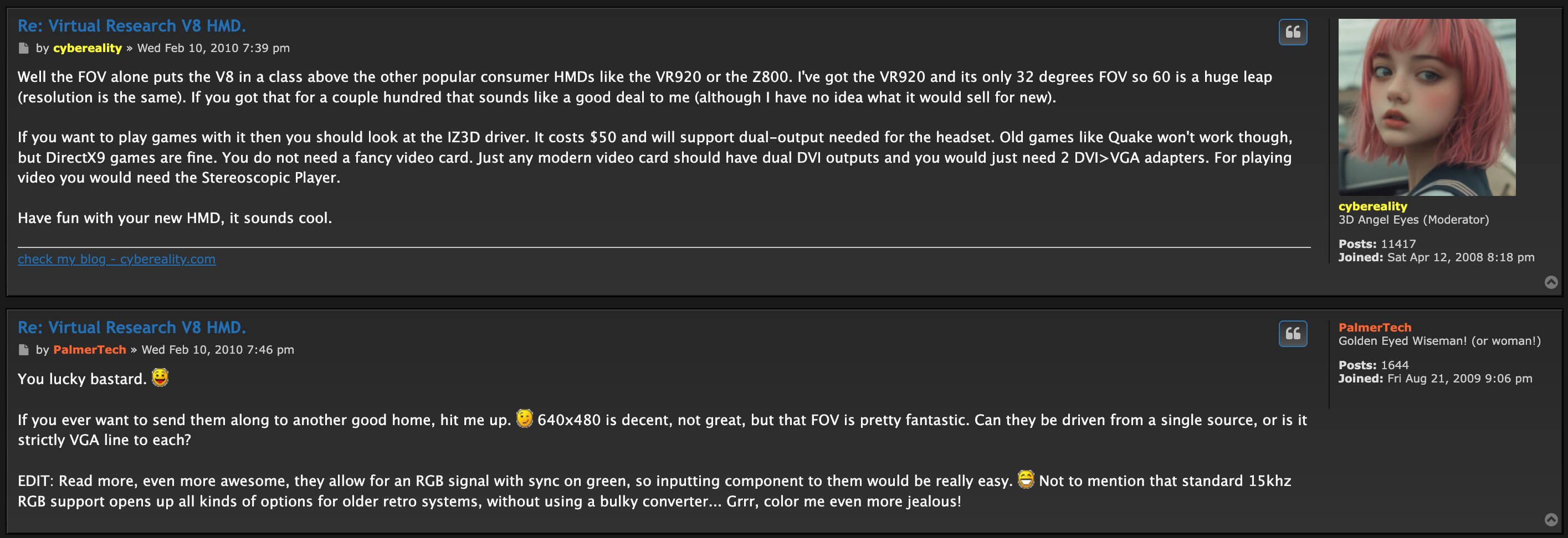 В 2010 году, за три года до выпуска Oculus Rift DK1, Палмер Лаки называл владельцев Virtual Research V8 «счастливчиками» (lucky bastard), просил продать их ему и отмечал, что спустя более десяти лет 60-градусное поле зрения устройства по-прежнему впечатляло.
